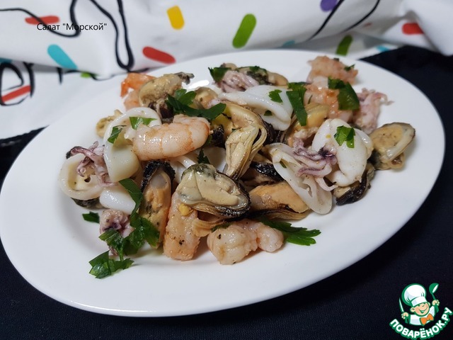 Полить отваренные морепродукты полученным соусом и отставить на 2 -3 часа для пропитки. Перед подачей добавить мелко нарезанную петрушку.