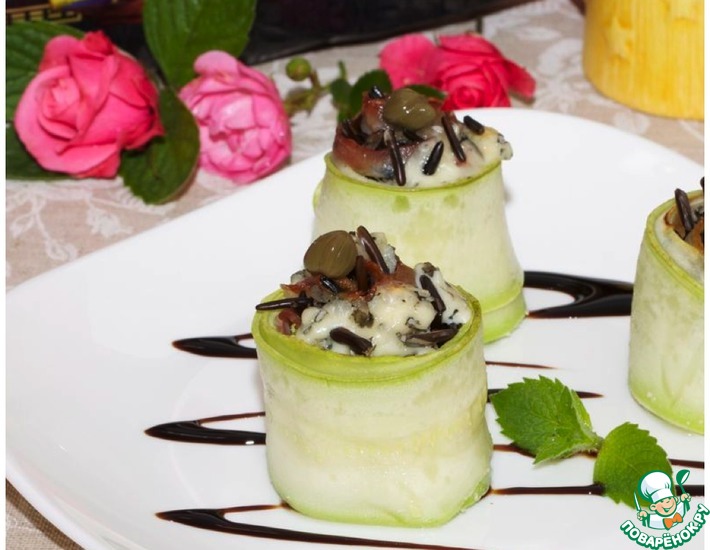 Завернуть "розочку" в ленты кабачка, я заворачивала в 3 штуки, соединяя предыдущую ленту с последующей внахлест.