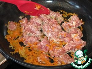 Обжарить лук, морковь, мясной фарш, добавить соль, перец, карри и перемешать.