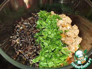 К рису добавить обжаренный фарш, нарезанную петрушку, перемешать.