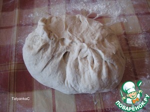 Выброженное тесто выкладываем на подпыленную поверхность, подкатать. Дать полежать несколько минут. После этого поверните тесто гладкой стороной вниз и сформируйте круглый хлебушек, заворачивая края теста к центру. Защипните шов в центре.
