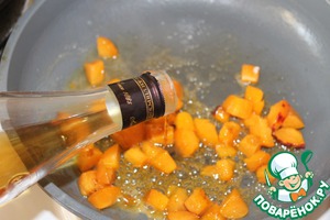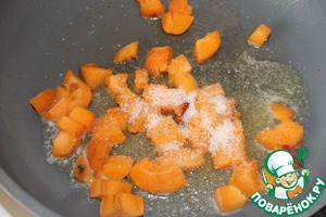 Пока рис варился, я на сковороде растопила сливочное масло, засыпала нарезанные абрикосы, тертый на терке корень имбиря, засыпала их коричневым сахаром и потушила минут 5-7 до растопления и карамелизации сахара, постоянно помешивая