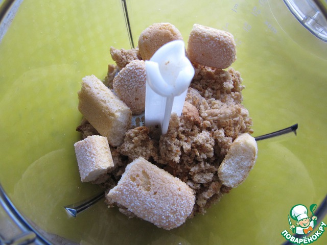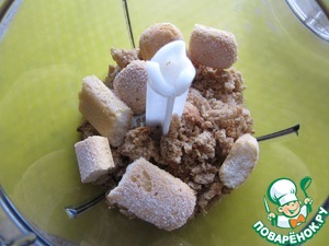 Для приготовления шоколадного слоя печенье измельчить в блендере, как можно мельче. Я использовала обрезки коржа для торта и печенье.