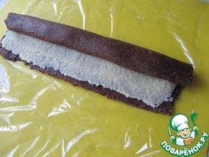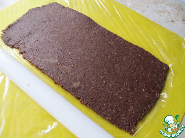 На пищевую пленку выложить шоколадный слой ровным тонким слоем в виде прямоугольника размером 15 на 25 см, примерно..