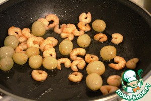 Виноград вместе с креветками слегка обжариваем на подогретом оливковом масле. Остужаем.