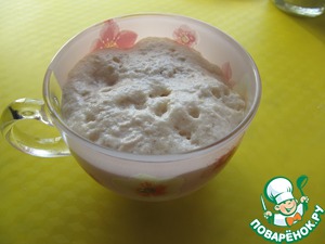 Из отмеренного количества молока часть отливаю в чашку с дрожжами, сыплю 1 ч л сахара. Как только поднялась шапочка, вижу, что дрожжи активные, приступаю к замесу теста.