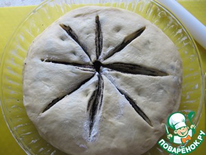 Разрезаем тесто на 8 кусочков, не дорезая по краям. Нож макала в муку, так легче было резать.