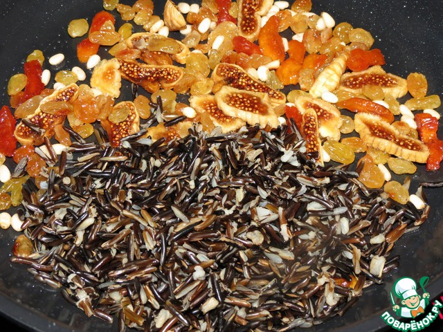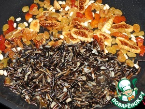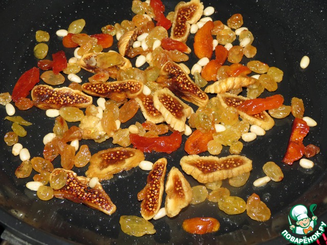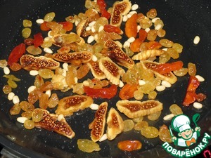 Обжарить кедровые орехи на сухой сковороде, затем добавить масло и слегка обжарить курагу, инжир, изюм, для того, что раскрыть немного вкус сухофруктов.