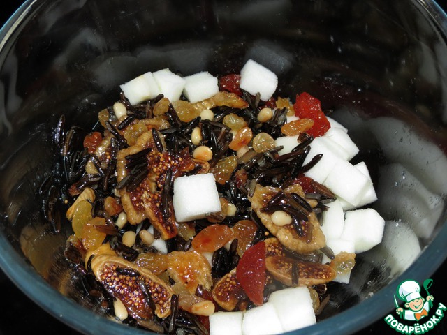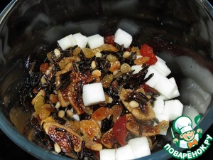 Пока рис варится, подготавливаем сухофрукты: курагу, инжир замочить в чае с бергамотом или воде. Яблоко нарезать на маленькие кубики.