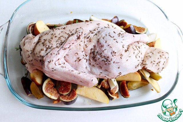 Сверху кладем утку. Да-да, сначала она такая огромная.. :) Насчет температуры запекания: я поставила в прогретую до 100С духовку и каждые 15 минут (примерно) повышала температуру на 10С. Температуру я повышала максимально до 180С, т. е. около 2х часов утка готовилась. Идея моя была такова, что сначала должен вытопиться жир, который пропитает фрукты и не даст им подгореть, и при этом к концу готовки утка не станет черной сверху.