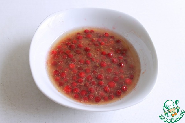 Жир слила в отдельную чашечку и добавила в него немного брусники, остудила и добавила к фруктовому пюре.