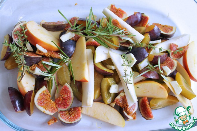Все фрукты порезать на дольки, сверху выложить веточки розмарина и тимьяна (но это, конечно, не обязательно) и раскидать крупно нарезанный чеснок (1 зубчик).