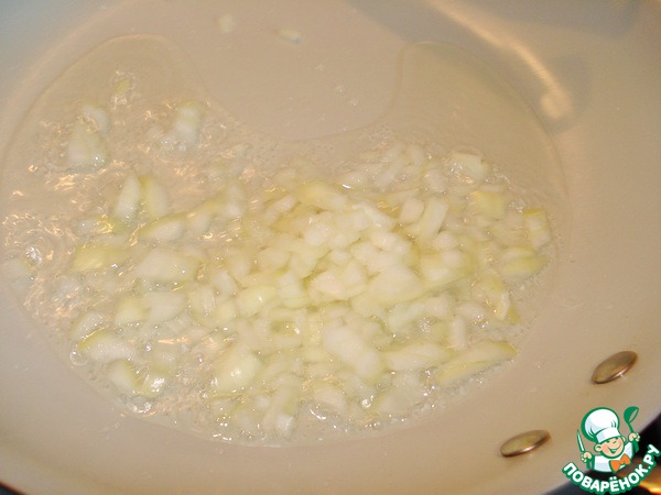 • В сковороде разогрейте небольшое количество растительного масла и обжарьте нарезанный репчатый лук, до золотистого цвета.