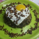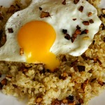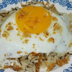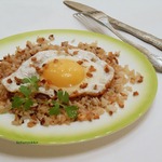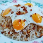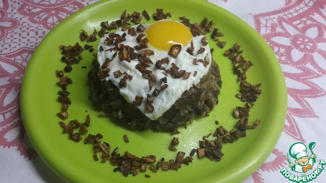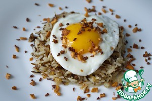• На тарелку выложить рис, сверху яйцо, и посыпать хрустящим имбирем с чесноком.