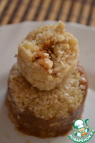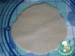 Одну четвертую часть ореховой массы хорошо вымесить и раскатать на посыпанной кунжутом поверхности в пласт, толщиной 3 мм.