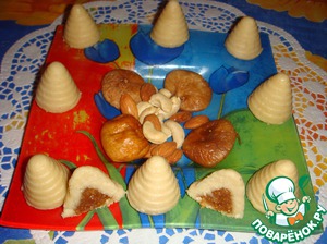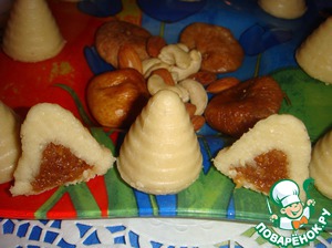 Скатать небольшой шарик из ореховой массы. Получается настолько пластичное "тесто", что можно вылепить из него любые фигурки и начинить инжирной массой.