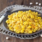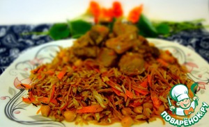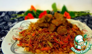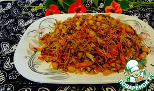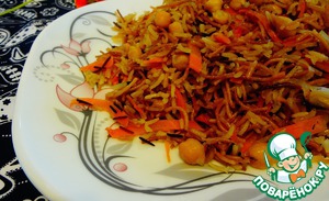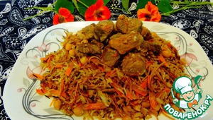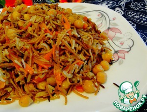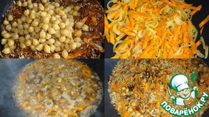Введём замоченный заранее горох "нут". Отдельно в казане начнём обжаривать лук и нарезанную соломкой морковь. Когда лук немного поджарится, а морковь станет мягкой, введём в казан поджаренные отдельно рис с вермишелью и горохом. Зальём кипятком на 1 палец выше риса. Посолим по вкусу. Закроем крышкой и варим минут 20. Выключаем и держим под крышкой ещё минут 10.