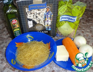 Для приготовления этого блюда нам потребуется дикий рис "Басмати mix" ТМ Мистраль (на самом деле это не совсем дикий рис. а смесь риса "басмати" и собственно дикого риса, но для краткости в дальнейшем этот рис я буду называть "диким"), вермишель " паутинка", замоченный заранее горох "нут", одна морковка, две небольшие репчатые луковицы, и масло - растительное и сливочное.
