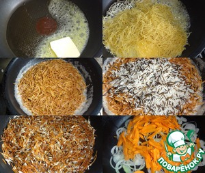 В сковороде разогреем сначала растительное масло, а потом распустим сливочное. Обжарим вермишель до нежно-коричневого цвета. Добавим к ней наш дикий рис. Немного подержим на огне до прозрачности.