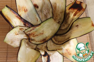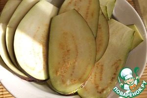 • Баклажаны нарезать тонкими ломтиками, залить подсоленной водой, оставить на 30 минут