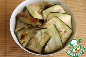 • Тем временем баклажаны отжать, обсушить и слегка обжарить на растительном масле. Выложить на салфетку для удаления лишнего жира