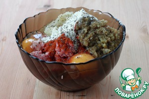 Мясо пропустить через мясорубку вместе с луком и баклажанами*. Добавить паприку (для того, чтобы наш хлеб был приятного розового оттенка), сухое молоко, яйца, соль и перец. Все очень хорошо смешать, лучше руками.