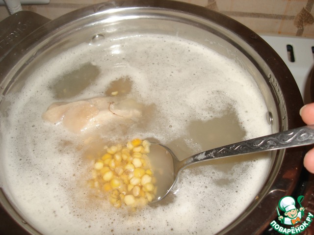 В кастрюлю одновременно с горохом помещаем и курицу (у меня было бедро). -