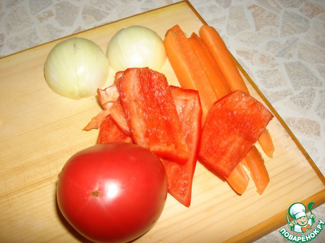 Займёмся овощами: морковь, лук, перец и помидоры моем, чистим и четвертуем (я чего-то увлеклась и порезала помельче, ничего - быстрее сварилось).