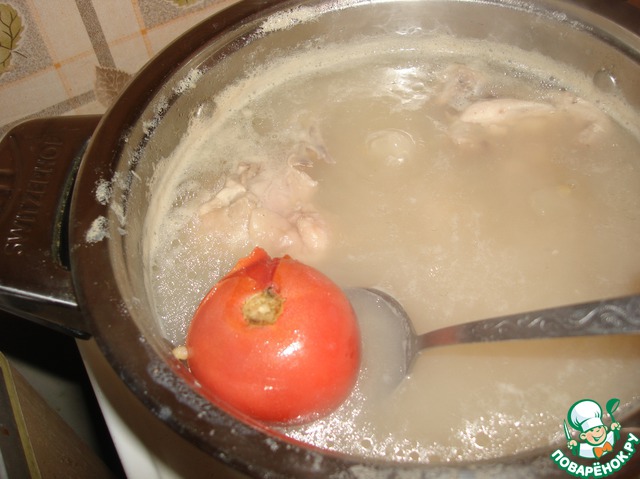 Помидоры не забываем раздеть. Для этого помещаем их на несколько секунд в кипящий бульон, затем под холодную воду, и вуа-ля кожица снимается сама!