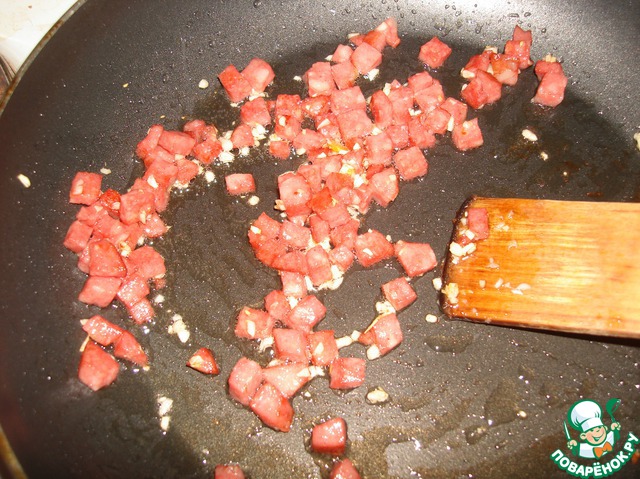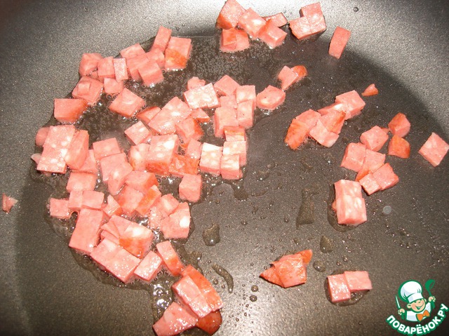 Теперь приготовим обжарку. Колбасу или другую копчёность нарезаем кубиками и подрумяниваем на символическом количестве масла.