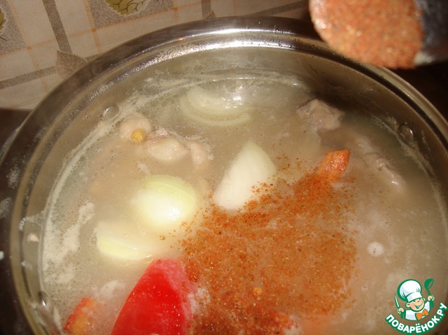 Сливаем часть бульона в чашку, так чтобы оставшийся покрывал овощи выше на 1 см.