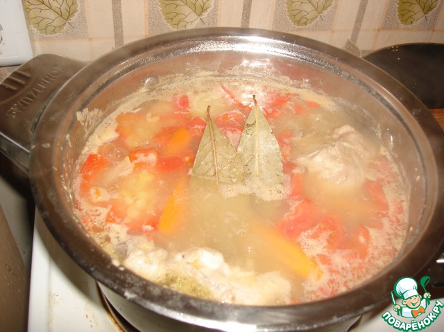 Через 10 минут добавляем помидоры и лавровый лист. Варим ещё минут 5-7 (до готовности овощей).