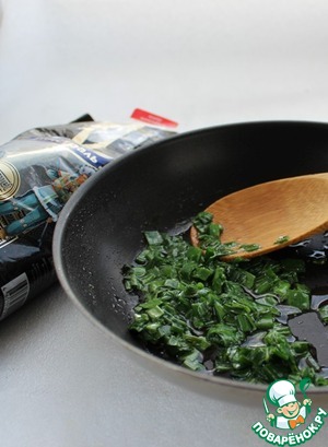Пока растапливается масло, нарезаем пучок зеленого лука. -