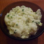 В сковороду с луком добавить рис и вмешать яйцо. Накрыть крышкой, потомить на медленном огне 2-3 минуты.