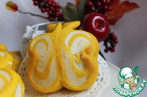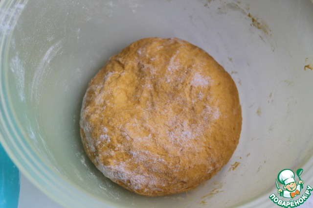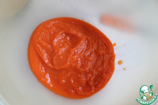 Итак, я взяла готовое детское пюре. Баночку 190 гр. (можно, конечно, самим сделать пюре или, например, взять тыквенноe). Прогрела его в микроволновке. Добавила туда 1,5 ч. л. дрожжей, 50 гр растопленного масла, 40 гр сахара, соль 0,5 ч. л., половинку яйца и муки 300 гр. Замесила тесто. (Сразу скажу, что булочки не сильно сладкие получаются, кто любит послаще, добавьте сахар.)