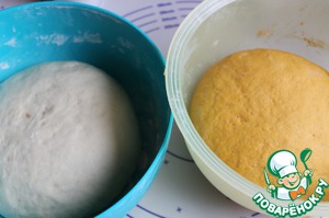 То же самое проделаем с другим тестом. Только теперь берем молоко 150 мл, теплое. Накроем наши 2 теста и дадим им подняться. У меня ушло где-то с час.