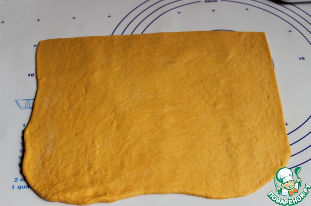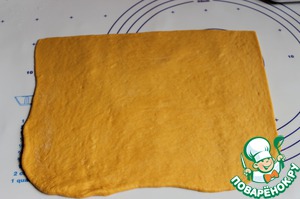 Берем наше морковное тесто делим на 2 части. И одну часть раскатываем в прямоугольник. Не сильно тонко, но и не толсто. Где-то 0,5 см.