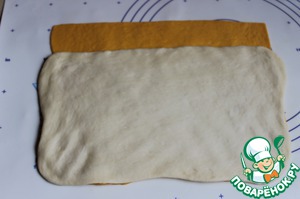 Белое тесто тоже раскатаем в прямоугольник, только немного меньше оранжевого. Прикладываем его вот таким образом, наверх. Слегка можно раскатать. Но без усилий, просто оно должно плотно прилегать.