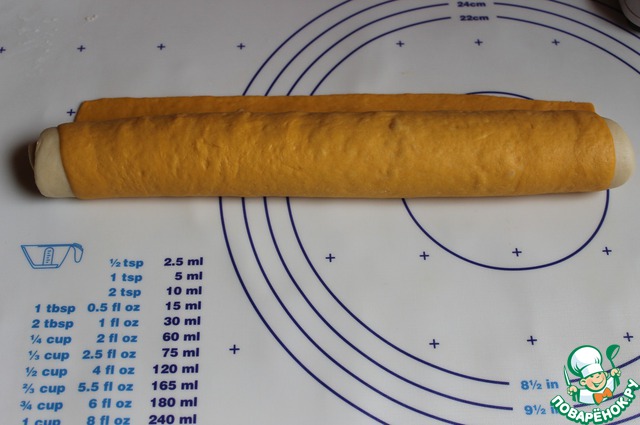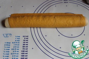 Скатываем тесто в рол но не до конца. Оставляем оранжевое тесто, примерно, 3-4 см.