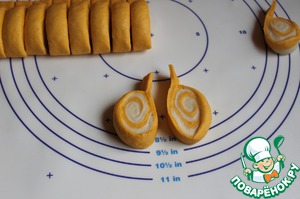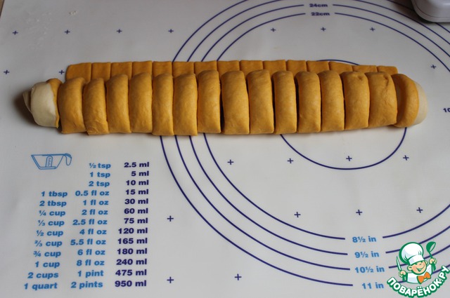 Нарезаем теперь наше тесто на такие сегменты, примерно 1 см шириной, может даже и больше.
