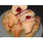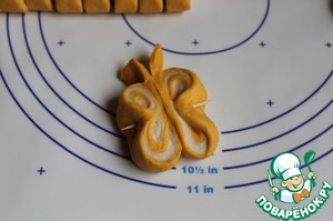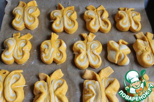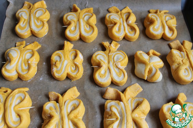 Вот такие бабочки получаются у нас. Я еще взяла зубочистки и проткнула посередине. Духовка у нас уже разогрета до 180 гр. Булочкам не даем времени на расстойку, иначе они сильно подымутся. Ставим их сразу в духовку на 15-20 минут.