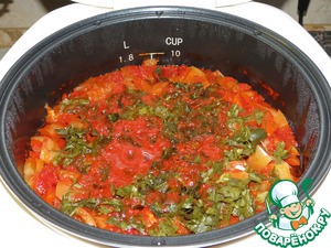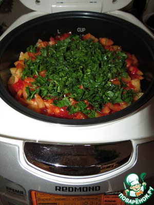 Вылить заливку в чашу мультиварки на овощи, сверху посыпать зеленью.