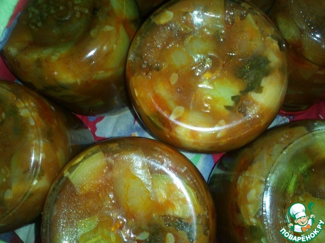 Мультя у меня на 5л - убралась вся порция. Воды налила чуть больше, мне жидкости не хватило - кабачки уже не такие сочные как летом. Получилось 5 баночек по 500мл и 1 - 700мл. Одну закатать не дали - съели сразу за ужином