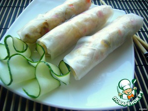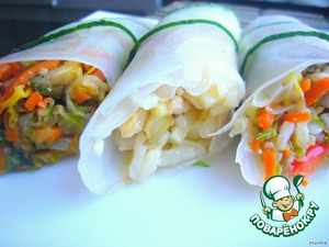 Налить воду в плоскую тарелку, которая по величине чуть больше рисовой бумаги. Рядом расстелить полотенце и приготовить второе. Поочередно обмакивать рисовые листы в воду и держать там 1 минуту. Потом осторожно расправлять их на полотенце и промокать вторым. Мягкий рисовый лист переложить на блюдо и разложить на нeм остывшие овощи, свернуть конвертом или рулетом. С остальными рисовыми листами поступать точно так же.