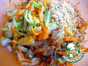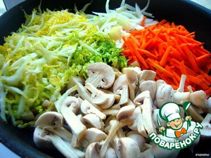 Лук нарезать вдоль соломкой, вспоминая глаза Ван Бастина, стараемся не плакать. Морковь сначала нарезать тонкими кружками, а потом кружки узкими полосками. Китайскую капусту также нарезать соломкой. Грибы очистить и разрезать на 4 части. Нагреть в глубокой сковороде растительное масло и, помешивая, обжарить в нем овощи. Добавить измельченный арахис, немного соли, перец и 2 ч. л. соев. соуса. Оставить остывать.