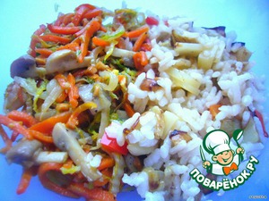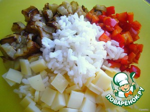 Обжарить нарезанный кружочками и подсоленный баклажан, порезать на кубики. В этом же масле обжарить нарезанный кубиками сладкий перец. Сыр тоже порезать кубиками и смешать всe с отваренным рисом. Добавить 2 ч. л. соевого соуса.