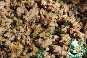 Пока тесто отдыхает, жарим лук до прозрачности. Добавляем фарш, даем жидкости испариться. Добавляем соль, по желанию приправу и зелень.