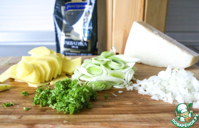 Картофель очистить и нарезать тонкими пластинками, если картофель крупный - разрезать их на половинки или четвертинки. Светлую часть порея нарезать тонкими косыми колечками. Измельчить луковицу и злень петрушки.