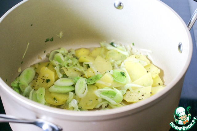 Следом добавить лук-порей и картофель. Обжаривать, помешивая, все вместе около 3-5 минут. Добавить соль и свежемолотый черный перец. По желанию влить и выпарить вино.