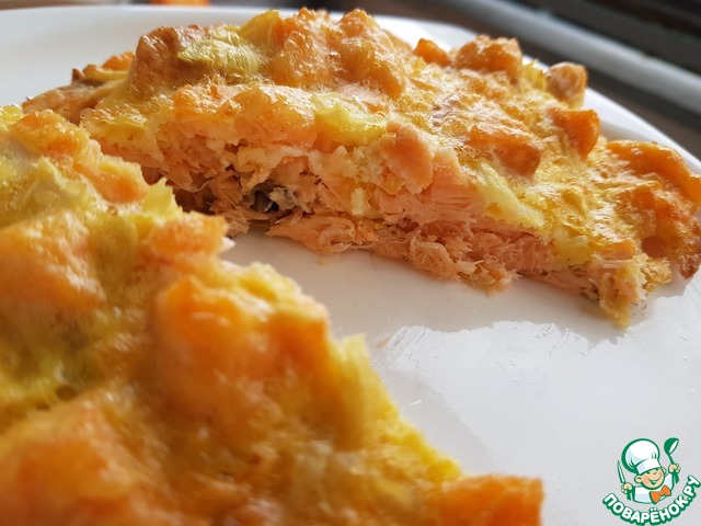 И аккуратно приготовленный фарш выложить на филе. Запекать в духовке при 200 гр. 30 минут.